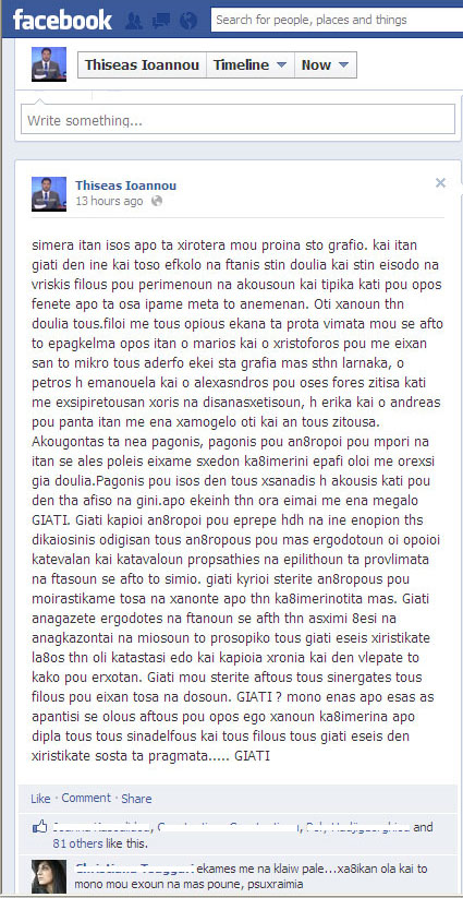 "Simera itan isos apo ta xirotera mou proina sto grafio. kai itan giati den ine kai toso efkolo na ftanis stin doulia kai stin eisodo na vriskis filous pou perimenoun na akousoun kai tipika kati pou opos fenete apo ta osa ipame meta to anemenan. Oti xanoun thn doulia tous. filoi me tous opious ekana ta prota vimata mou se afto to epagkelma..." έγραψε ανάμεσα σε άλλα ο δημοσιογράφος του ΑΝΤ1, μη κρύβοντας τη λύπη του για την απόλυση κάποιων εκ των συναδέλφων του...
