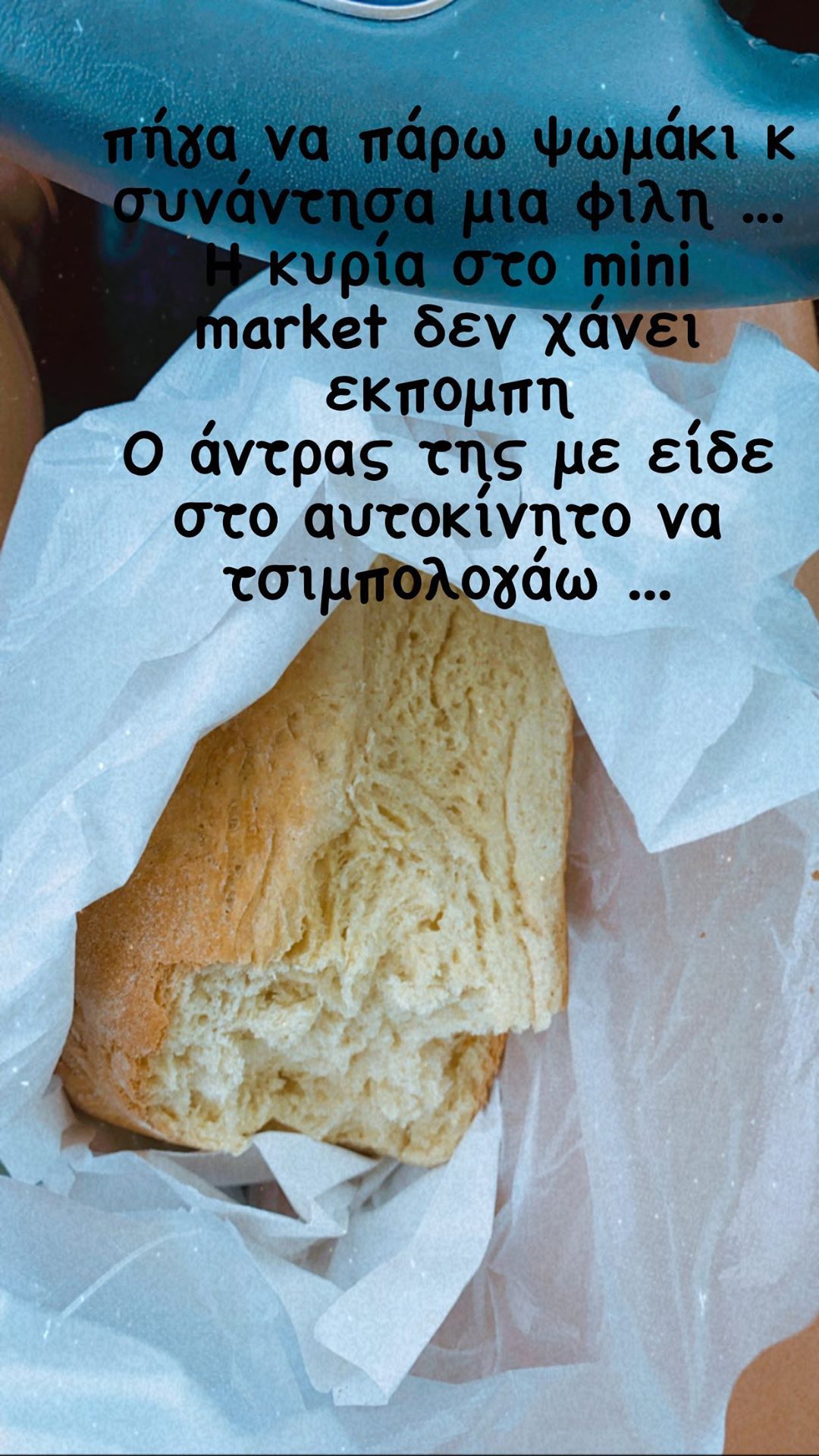 "Πήγα να πάρω ψωμάκι και συνάντησα μια φίλη... Η κυρία στο mini market δεν χάνει εκπομπή. Ο άνδρας της με είδε στο αυτοκίνητο να τσιμπολογάω... μου έφερε και ελιές. Αυτή είναι η Χαλκιδική που αγαπώ", ήταν όλα όσα έγραφαν οι δυο εικόνες που ανήρτησε στα stories της. Δείτε τις εικόνες πιο κάτω: