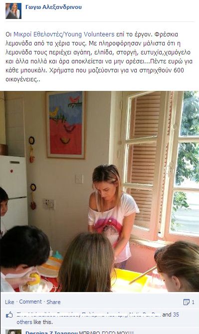 "Οι Μικροί Εθελοντές/Young Volunteers επί το έργον. Φρέσκια λεμονάδα από τα χέρια τους" έγραψε η Γωγώ στο προφίλ της στο facebook, ανεβάζοντας και μια όμορφη φωτογραφία από την όλη προσπάθεια της ομάδας. "Πέντε ευρώ για κάθε μπουκάλι. Χρήματα που μαζεύονται για να στηριχθούν 600 οικογένειες..." κατέληξε με το post της. Δείτε το εδώ!