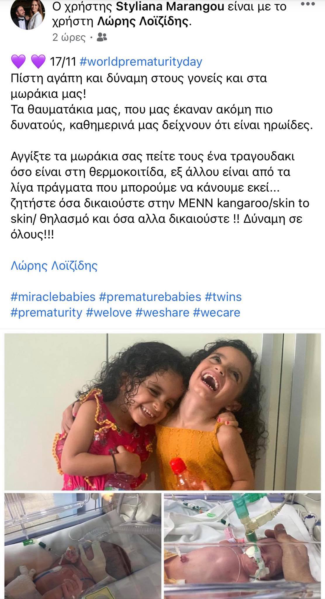 Ανάμεσα σε αυτές και η Στυλιάνα Μαραγκού όπου μαζί με τον σύζυγο της Λώρη Λοιζίδη νιώθουν ευλογημένοι για τις δίδυμες κόρες τους που τα κατάφεραν μέσα από δύσκολες συνθήκες. Η Στυλιάνα αφού ανήρτησε φωτογραφίες από την γέννηση των παιδιών της έγραψε: