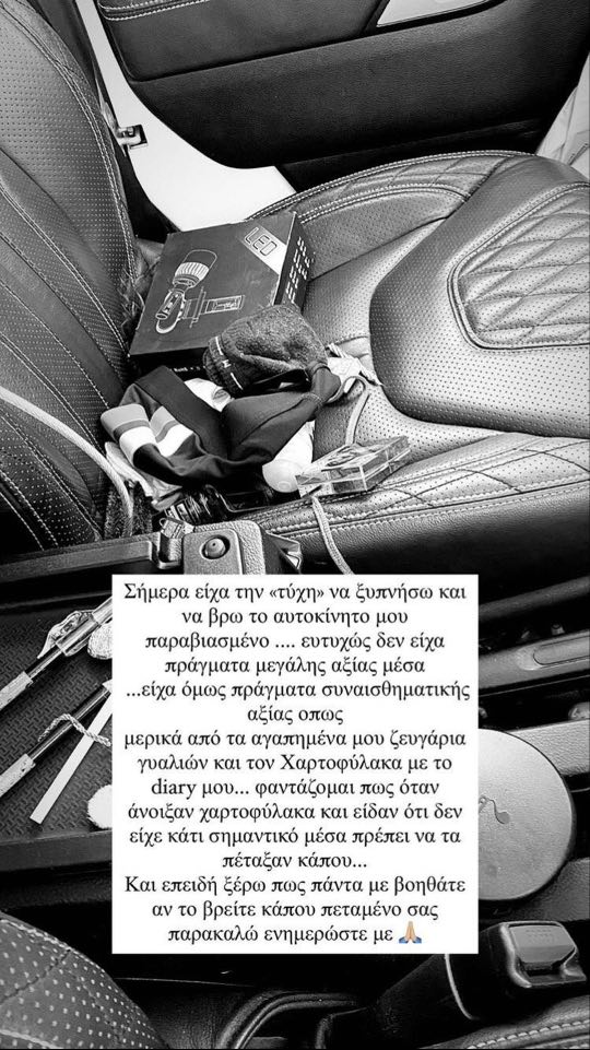 “Σήμερα είχα την “τύχη” να ξυπνήσω και να βρω το αυτοκίνητό μου παραβιασμένο. Ευτυχώς δεν είχα πράγματα μεγάλης αξίας μέσα. Είχα όμως πράγματα συναισθηματικής αξίας όπως μερικά από τα αγαπημένα μου ζευγάρια γυαλιών και τον χαρτοφύλακα με το diary μου. Φαντάζομαι πως όταν άνοιξαν τον χαρτοφύλακα και είδαν ότι δεν είχε κάτι σημαντικό μέσα πρέπει να τα πέταξαν κάπου. Και επειδή ξέρω πως πάντα με βοηθάτε αν το βρείτε κάπου πεταμένο σας παρακαλώ ενημερώστε με”, έγραψε η Θέλξια Βαλέρια στην ανάρτησή της. Δείτε πιο κάτω τη σχετική εικόνα που εντοπίσαμε στα social media: