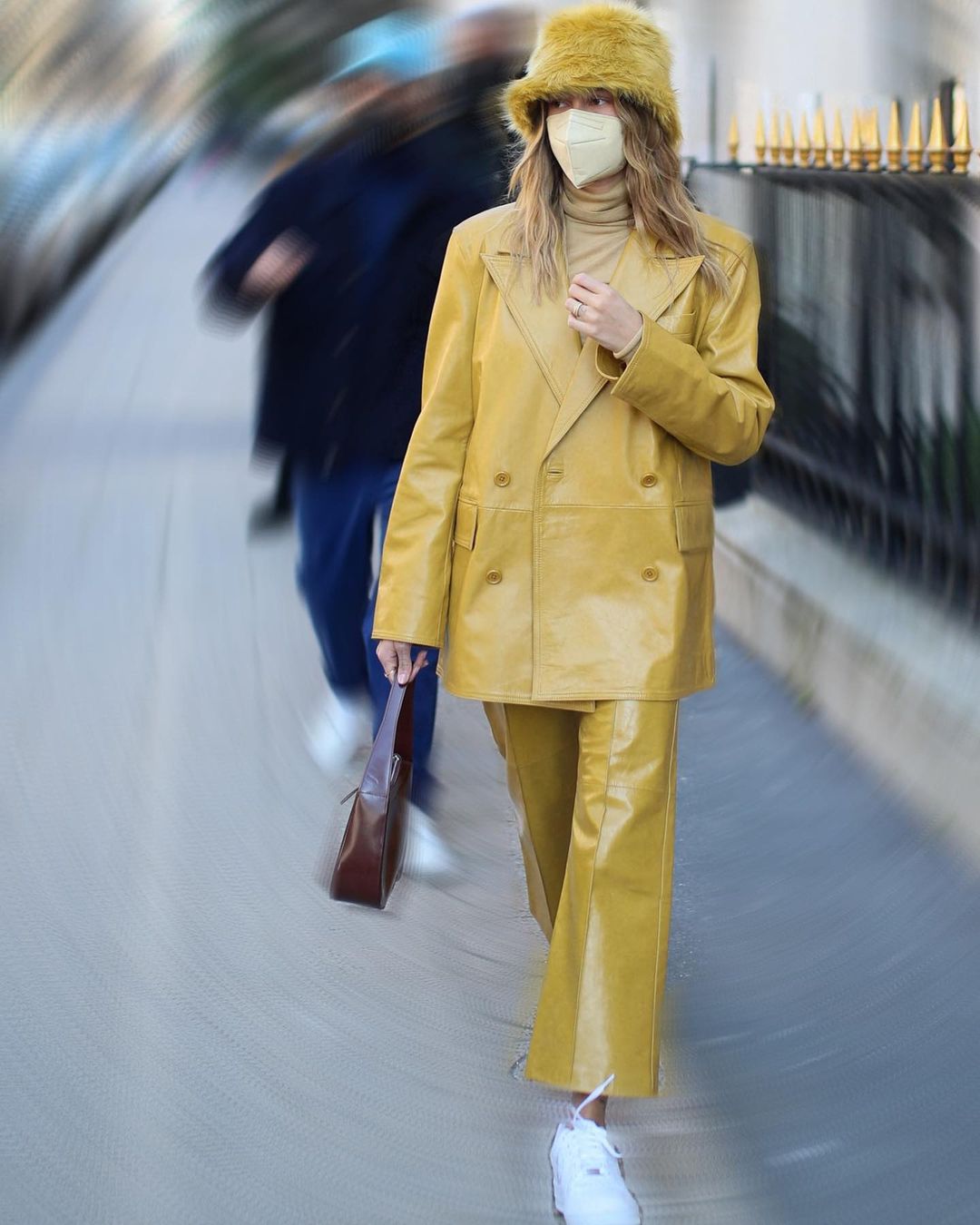 Το μοντέλο Hailey Bieber φόρεσε ένα κίτρινο δερμάτινο κοστούμι από το Σκανδιναβικό brand Stand Studio στο Παρίσι - και δημιούργησε ένα effortless και άνετο look. Το συνδύασε με ένα γούνινο bucket hat, τα αγαπημένα της Air Force One αθλητικά και μια τσάντα ώμου σε σοκολατί χρώμα από το brand By Far.