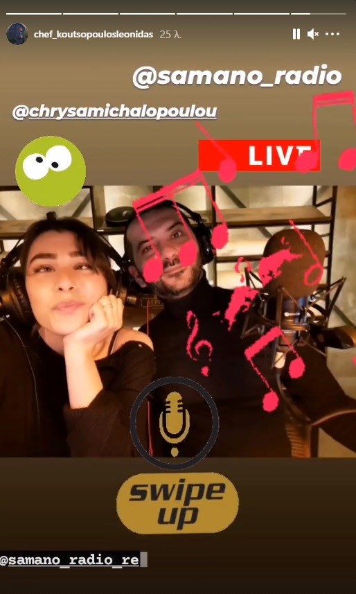 Στη σχετική εικόνα που ανέβασε ο ίδιος σε instastory του,βλέπουμε το ζευγάρι να ποζάρει μαζί στον φακό, λίγο πριν βγουν στον αέρα του “Samano radio”, του διαδικτυακού ραδιοφωνικού σταθμού του Λεωνίδα Κουτσόπουλου. Δείτε την εικόνα πιο κάτω: