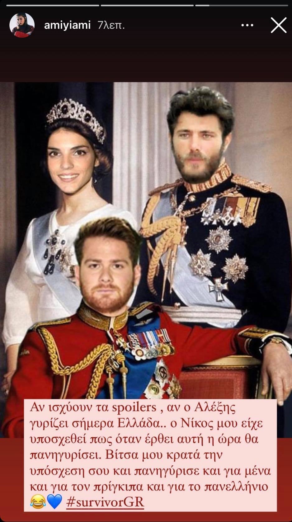 Mάλιστα σχολίασε χαρακτηριστικά: "Aν ισχύουν τα spoilers, αν ο Αλέξης γυρίζει σήμερα Ελλάδα… ο Νίκος μου είχε υποσχεθεί πως όταν έρθει αυτή η ώρα θα πανηγυρίσει…Βίτσα μου κράτα την υπόσχεσή σου και πανηγύρισε και για μένα και για τον πρίγκιπα και για το Πανελλήνιο”. Δείτε την εικόνα πιο κάτω: