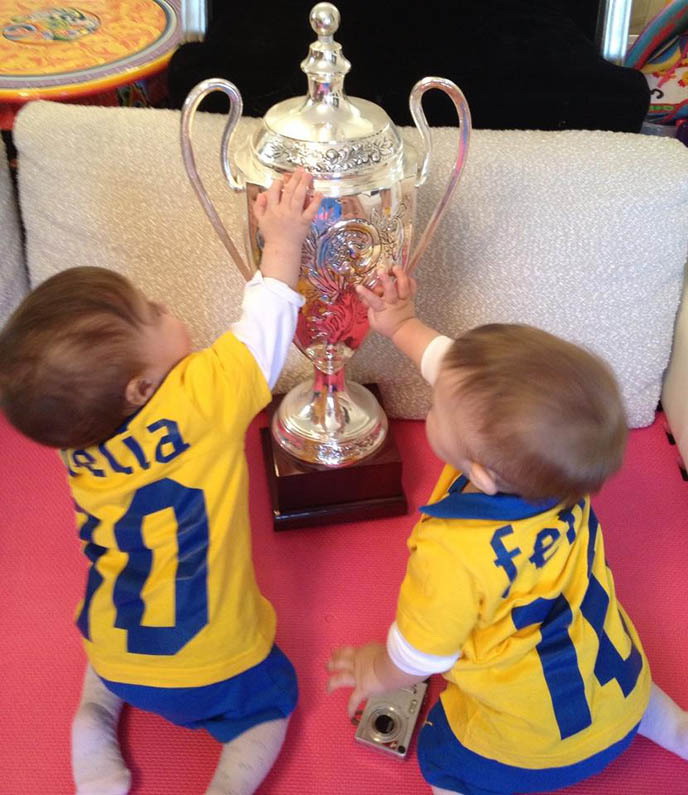 Από χθες μαθηματικά ο ΑΠΟΕΛ είναι η πρωταθλήτρια ομάδα μετά την ήττα της Ανόρθωσης. Όπως είναι λογικό οι πρωταγωνιστές αυτής της επιτυχίας πλέουν σε πελάγη ευτυχίας. Ένας από αυτούς φυσικά και ο αρχηγός της ομάδας ο Κωνσταντίνος Χαραλαμπίδης που ανέβασε στους προσωπικούς του λογαριασμούς στα social media τις δυο δίδυμες κορούλες τους να φοράνε φανέλες του ΑΠΟΕΛ και να ακουμπούν ένα τρόπαιο. Η λεζάντα που συνόδευε τη γλυκιά αυτή φωτογραφία έλεγε: «Έτσι μπράβο, μας αξίζει».