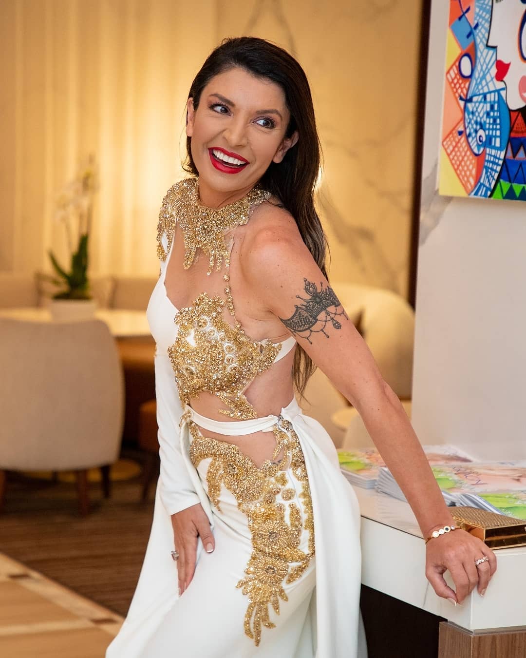Για την εκδήλωση, επέλεξε να φορέσει μια εκθαμβωτική λευκή και χρυσή δημιουργία με cut-outs που άφηνε ακάλυπτο τον ένα ώμο από την πετυχημένη Κύπρια σχεδιάστρια Έφη Παπαϊωάννου. Το συγκεκριμένο φόρεμα είχε επένδυση από πέτρες και χρυσοκλωστή που πρόσθεταν επιπλέον λάμψη στο όλο look ενώ στο κάτω μέρος του φορέματος προστέθηκε μια επιπλέον στρώση από ύφασμα στο πίσω μέρος που έδινε περισσότερο όγκο και αέρα στο φόρεμα. Η Μαρία συμπλήρωσε το σύνολο με γόβες σε nude απόχρωση και χρυσό clutchbag.