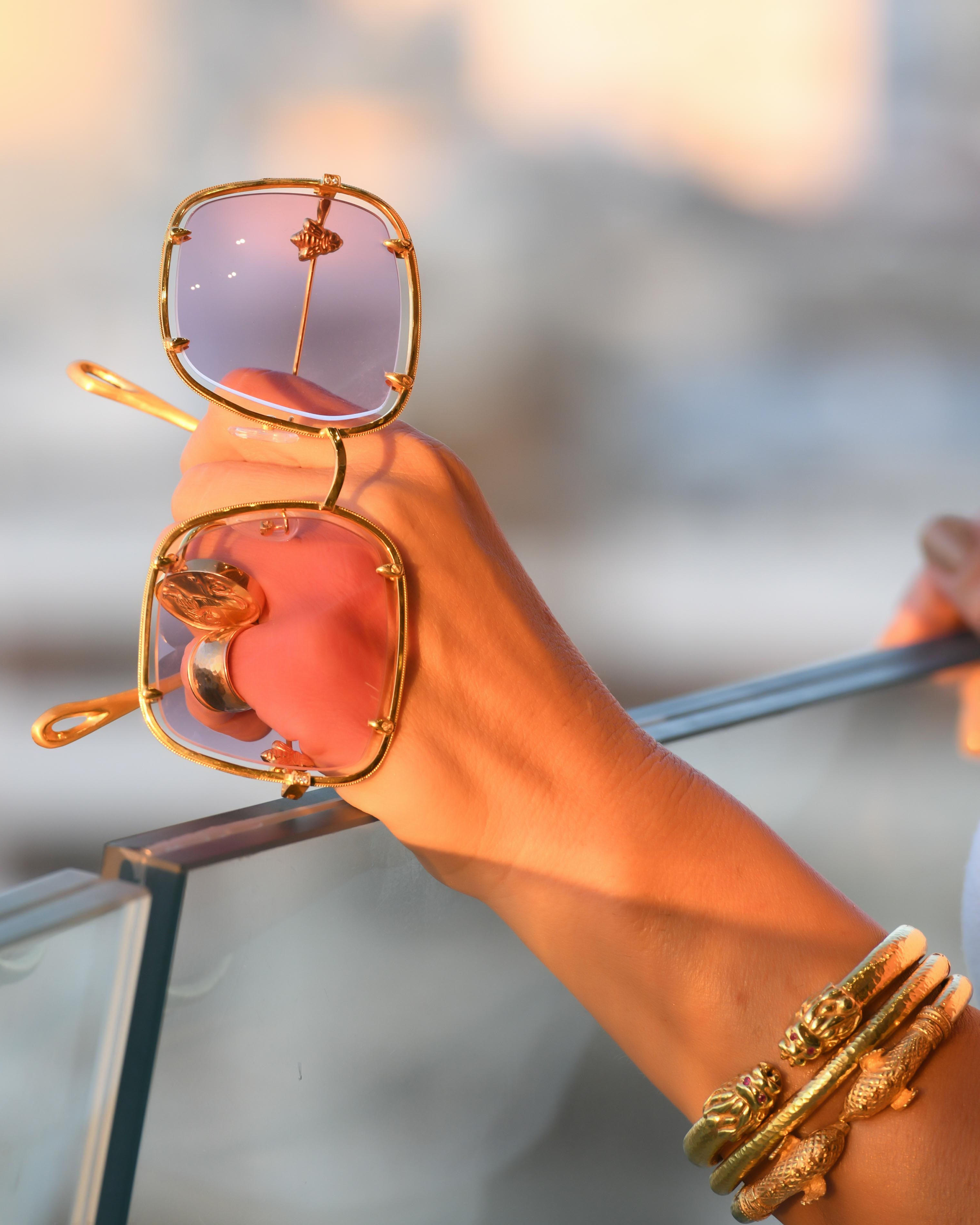 Τα γυαλιά ηλίου “The Royal Bee” διακρίνονται από ένα μοναδικό σκελετό, εξ ολοκλήρου χειροποίητο από μασίφ χρυσό 18 καρατίων αναμεμειγμένο στο αποκλειστικό κίτρινο αρχαϊκό χρώμα του οίκου.