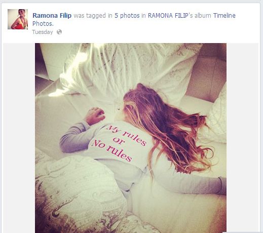Στη νέα φωτογραφία της Νικόλ, που ανέβασε η όμορφη Ramona στο facebook, η μικρή κοιμάται φορώντας ένα μπλουζάκι που αναγράφει: "My rules or no rules". H περήφανη μαμά μάλιστα, την σχολίασε με χιούμορ.
