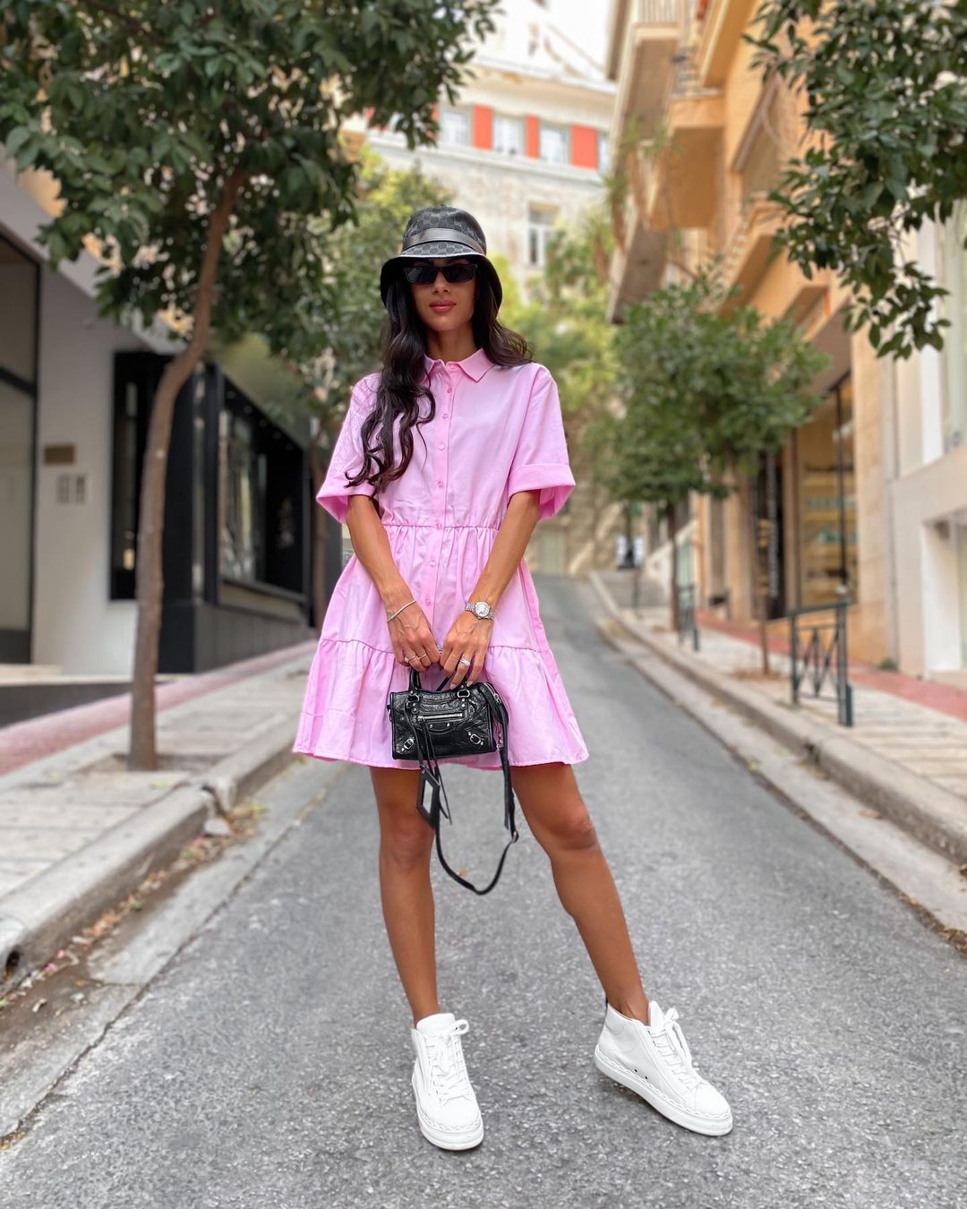 Ροζ φόρεμα σε στυλ shirt dress με λευκά sneakers