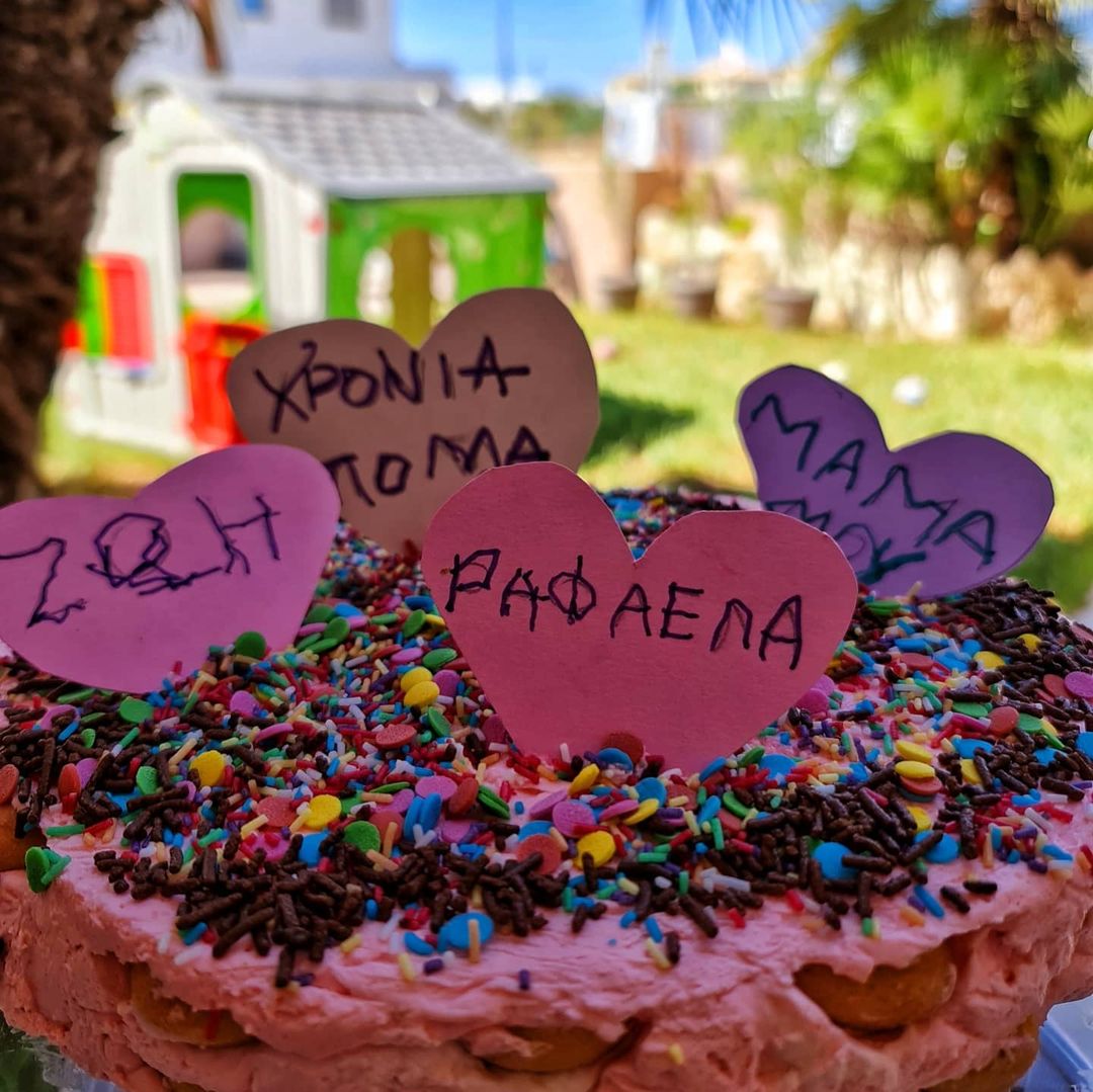 Επίσης στην τούρτα οι μικρούλες ευχήθηκαν στη μητέρα της, γράφοντάς της "Χρόνια πολλά μάμα μου...Ζωή, Ραφαέλλα".Δείτε πιο κάτω τις σχετικές εικόνες: