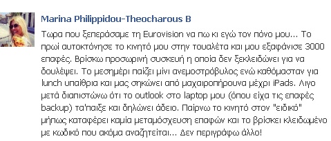 Μία πραγματικά απίστευτη «περιπέτεια» έζησε η Μαρίνα Φιλιππίδου Θοεχάρους και είχε σχέση με την τεχνολογία ενώ δεν έλειψαν και οι περίεργες συμπτώσεις. Και για να είμαστε πιο συγκεκριμένοι το κινητό της Μαρίνας έκανε την αρχή αυτής της περιπέτειας. Η παρουσιάστρια θέλησε να πει στον πόνο της, όπως είπε στους διαδικτυακούς της φίλους και πόσταρε το εξής: «Τώρα που ξεπεράσαμε τη Eurovision να πω κι εγώ τον πόνο μου... Το πρωί αυτοκτόνησε το κινητό μου στην τουαλέτα και μου εξαφάνισε 3000 επαφές. Βρίσκω προσωρινή συσκευή η οποία δεν ξεκλειδώνει για να δουλέψει. Το μεσημέρι παίζει μίνι ανεμοστρόβιλος ενώ καθόμασταν για lunch υπαίθρια και μας σηκώνει από μαχαιροπήρουνα μέχρι iPads. Λίγο μετά διαπιστώνω ότι το outlook στο laptop μου (όπου είχα τις επαφές backup) τα' παιξε και δηλώνει άδειο. Παίρνω το κινητό στον "ειδικό" μήπως καταφέρει καμία μεταμόσχευση επαφών και το βρίσκει κλειδωμένο με κωδικό που ακόμα αναζητείται... Δεν περιγράφω άλλο»!