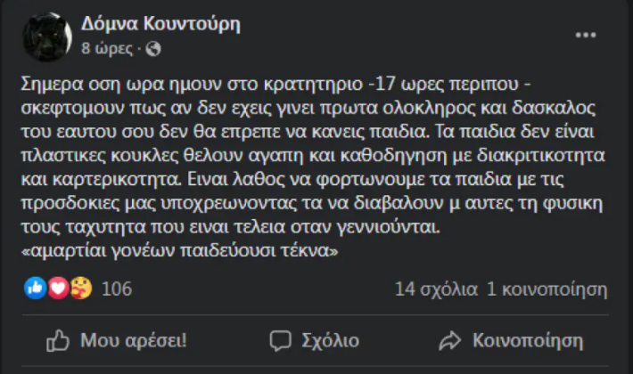 Μάλιστα, στην τελευταία της ανάρτηση, την οποία και διέγραψε λίγη ώρα μετά, η Δόμνα Κουντούρη αποκάλυψε πως βρίσκεται στο Δρομοκαΐτείο, μετά από παρέμβαση του πατέρα της, ο οποίος -κατά τα λεγόμενά της- δεν την καταλαβαίνει.