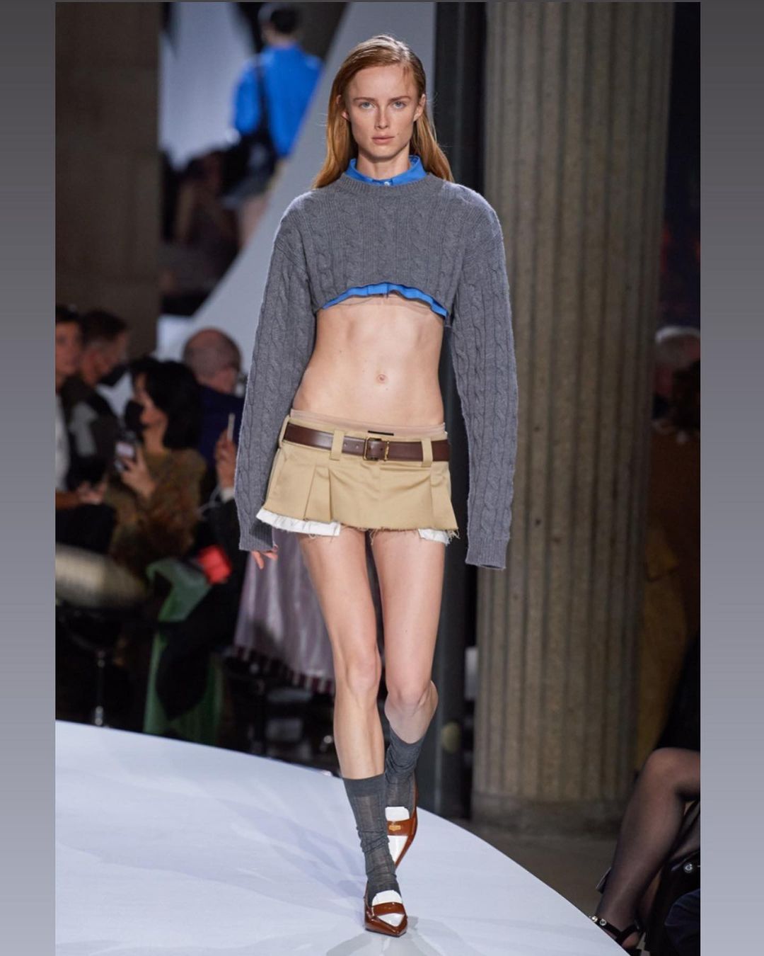 Για τη σεζόν SS22 ο οίκος Miu Miu λάνσαρε ένα iconic school girl look που αποτελείται από ένα crop πλεκτό πουλόβερ φορεμένο πάνω από πουκάμισο συνδυασμένο με μία χαμηλόμεση μίνι φούστα.