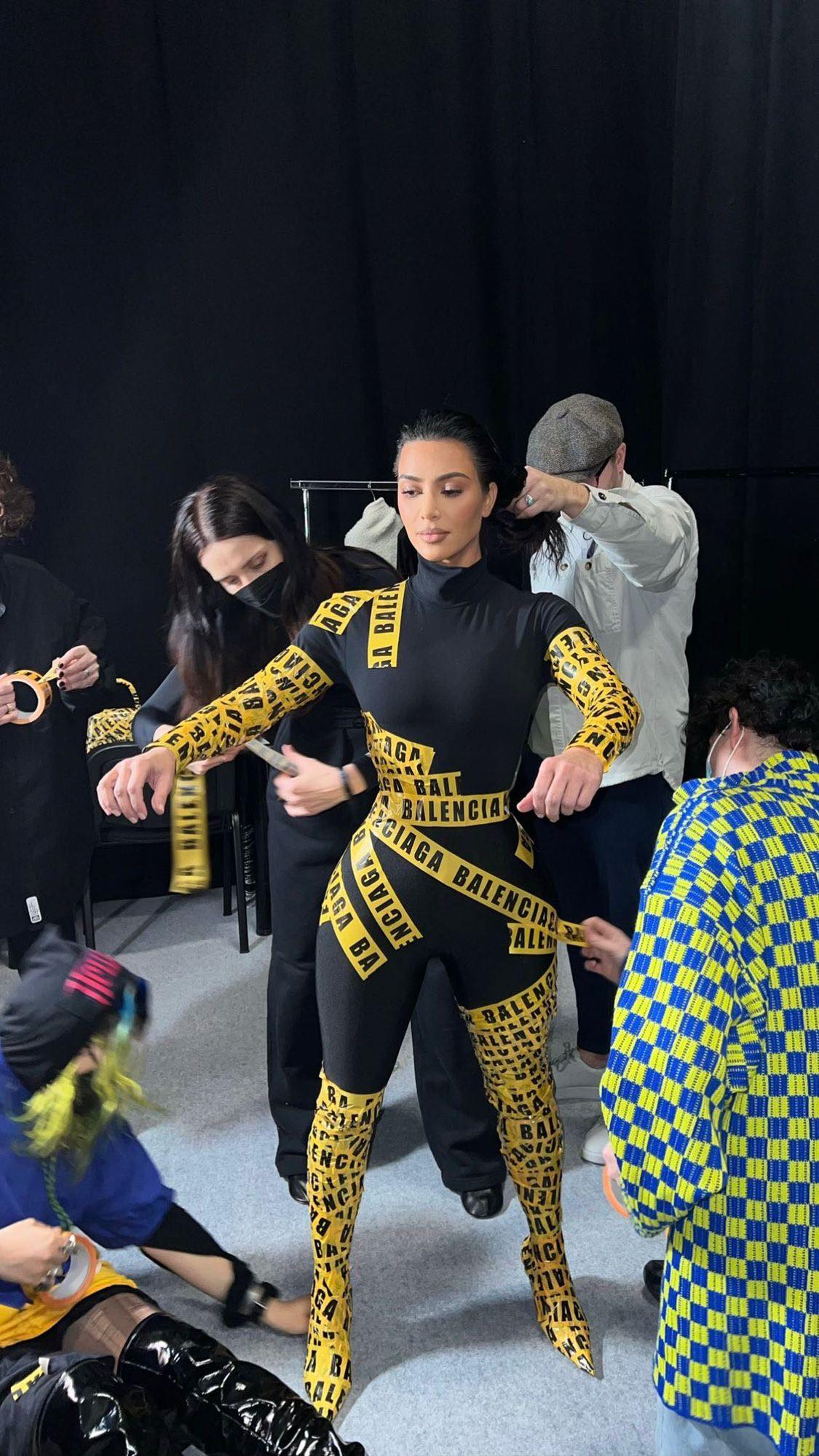 Η Kim Kardashian επέλεξε ένα ιδιαίτερο outfit που έφερε βεβαίως την υπογραφή του brand, όπου τύλιξε τις διάσημες καμπύλες της με κίτρινη κολλητική ταινία με το logo του Balenciaga.