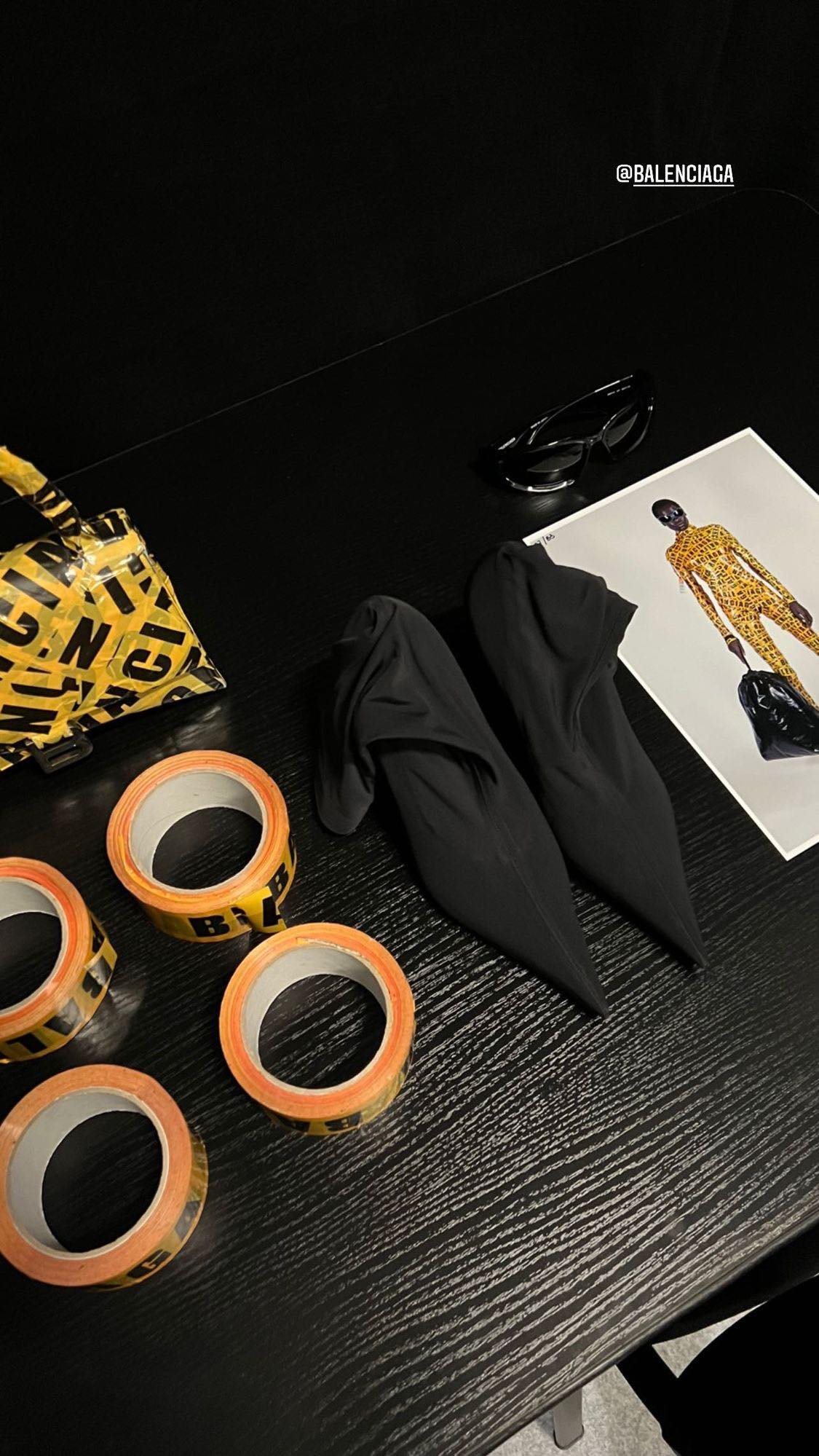 Η Kardashian φορούσε ένα στενό κορμάκι και ψηλοτάκουνες μπότες ενώ κρατούσε μια τσάντα, όλα καλυμμένα με την ταινία. Ολοκλήρωσε το σύνολο με ένα ζευγάρι μαύρα γυαλιά ηλίου Balenciaga.