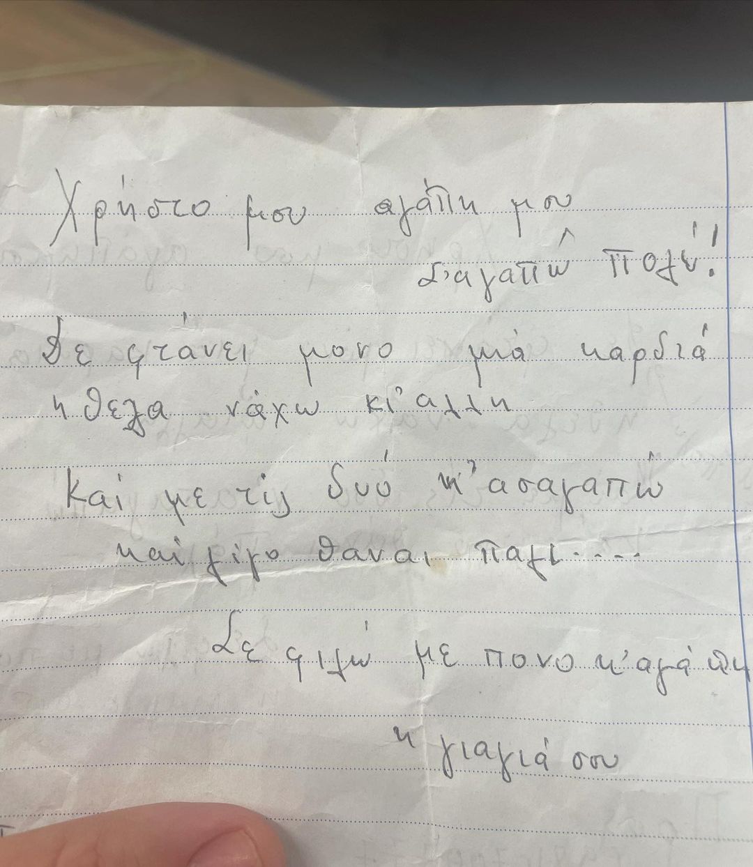 Στη λεζάντα της εικόνας στην οποία μας δείχνει το γράμμα της γιαγιάς του, σχολίασε τα εξής: "Η ημέρα της γυναίκας μόλις πέρασε… Μια μέρα που όλοι θυμούνται πως μια μάνα τους γέννησε, μια κόρη τους έδωσε ξανά ζωή, μια γιαγιά τους κανάκεψε και πάει λέγοντας… Το χθεσινό βράδυ λοιπόν με βρήκε να ξυπνάω από κλάματα για τη γυναίκα που με έμαθε να είμαι άνθρωπος… Με έμαθε να να αγαπώ τον εαυτό μου, να λέω «δεν πειράζει», να λέω «ξικι να γένει»(οι Ηπειρώτες θα καταλάβουν) να κακομαθαίνω τους φίλους, να δίνω πιο πολύ από όσο θα πάρω, να ρίχνω τον εαυτό μου για να ανέβουμε πιο ψηλά όλοι, να γίνομαι η ψυχή της παρέας, να συγχωρώ και να αγαπώ! Αυτή γυναίκα ήταν η γιαγιά μου…Γιαγιά μπορεί να μην ειχες δυο καρδιές όπως λες στο γράμμα σου αλλά είχες την πιο μεγάλη… Μακάρι να είχα δυο καρδιές να σου δώσω να πάρεις μια μαζί σου…". Δείτε πιο κάτω την εικόνα: