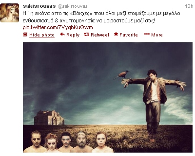 Την πρώτη φωτογραφία απο τις Βακχες που θα παίξει ο Σάκης το καλοκαίρι ανέβασε ο ίδιος στον προσωπικό του λογαριασμό στο twitter γράφοντας πως είναι πολύ ενθουσιασμένος και χαρούμενος για αυτή του την συνεργασία...