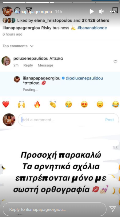 Ωστόσο, βλέποντας τον τρόπο που το έγραψε, η Ηλιάνα σήκωσε τα μανίκια και την τρόλαρε με αυτόν τον τρόπο, αφού πρώτα την διόρθωσε με το “απαίσια”: “Προσοχή παρακαλώ. Τα αρνητικά σχόλια επιτρέπονται μόνο με σωστή ορθογραφία". Δείτε πιο κάτω την εικόνα: