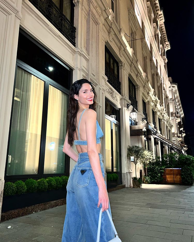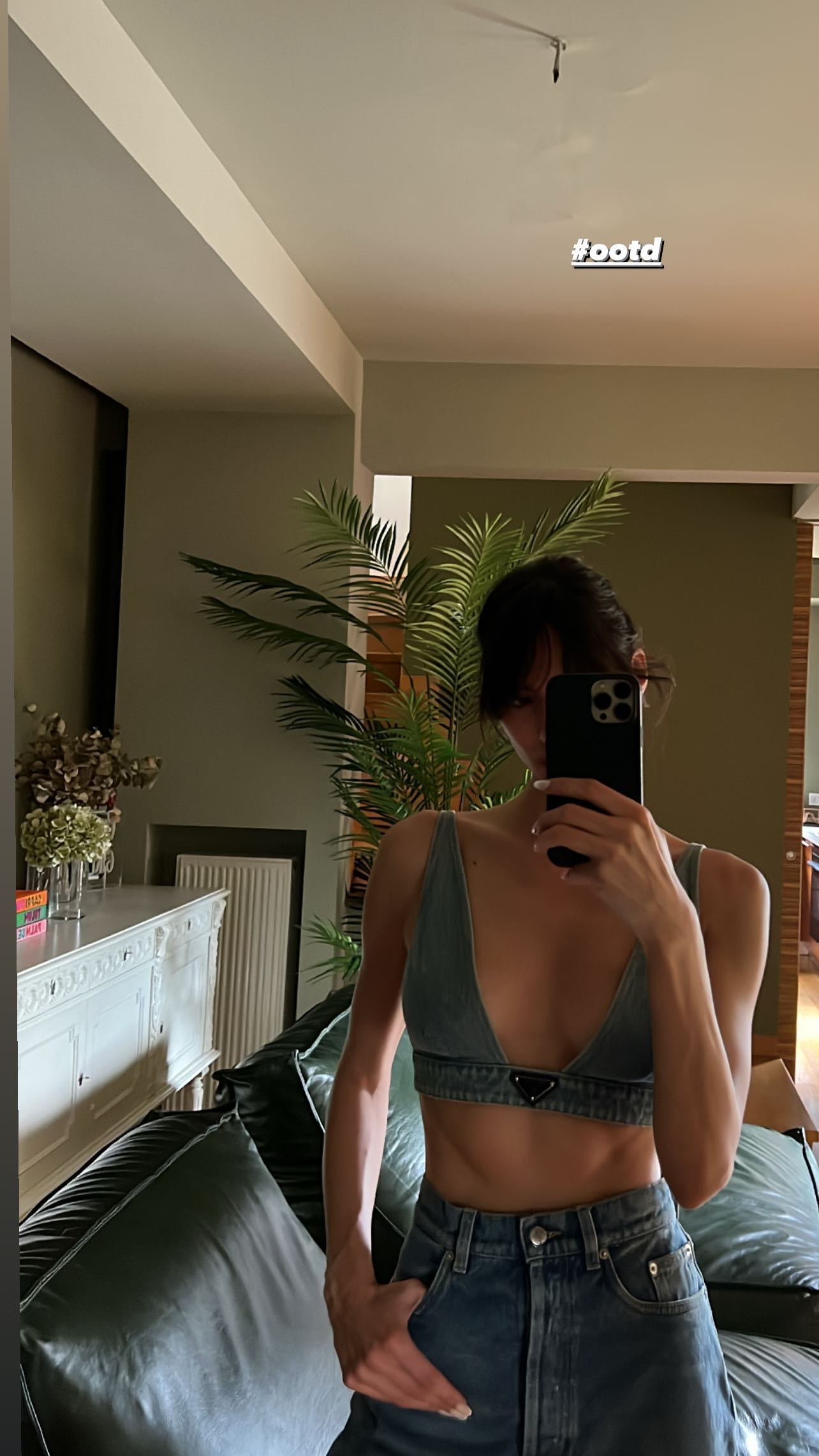 To πρώτο look αποτελείται από ένα denim bra top και ένα ψηλόμεσο wide leg τζιν και το δεύτερο look από ένα μαύρο σετ με bra top και shorts.