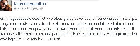 Μία από τις πιο ευτυχισμένες μέρες της ζωής της έζησε το περασμένο Σάββατο η Κατερίνα Αγαπητού αφού μετά τον πολιτικό γάμο της με τον Κρίστιαν Ονουφρίου ανέβηκαν μαζί και τα σκαλιά της εκκλησίας. Η ίδια θέλησε να ευχαριστήσει τα άτομα που βρέθηκαν κοντά της εκείνη την μέρα ενώ μίλησε και με τρυφερά λόγια για τον άντρα της ζωή της. Δείτε τι έγραψε στον προσωπικό της λογαριασμό στο facebook: