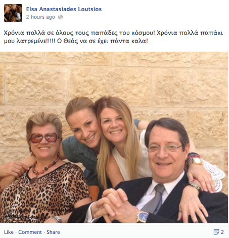 Μέσω των κοινωνικών δικτύων η κόρη του Προέδρου της Δημοκρατίας επέλεξε να ευχηθεί χρόνια πολλά στον πατέρα της, Νίκο Αναστασιάδη. Μάλιστα η Έλσα Αναστασιάδη επέλεξε μία οικογενειακή φωτογραφία να ανεβάσει στο facebook και να στείλει το δικό της μήνυμα για τη σημερινή ημέρα. Συγκεκριμένα, η Έλσα έγραψε: Χρόνια πολλά σε όλους του μπαμπάδες του κόσμου! Χρόνια πολλά παπάκι μου λατρεμένε!!! Ο Θεός να σε έχει πάντα καλά!