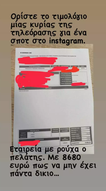 Το πρωί της επόμενης ημέρας, δημοσίευσε ένα story του με τιμολόγιο, στο οποίο υπήρχε το ποσό των 8.680 ευρώ (7.000 ευρώ + ΦΠΑ 24%) πρόδωσε το ποσό που κοστολογεί τα posts της η Ελένη Μενεγάκη.