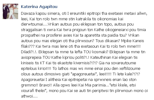 Με την ερευνητική επιτροπή της χώρας μας τα έβαλε έξαλλη η Κατερίνα Αγαπητού. Αφορμή η είδηση ότι η ερευνητική επιτροπή θα εξετάσει μεταξυ άλλων και τον ρόλο των Μ.Μ.Ε. στην κατρακύλα τις κυπριακής οικονομίας. Δείτε τι έγραψε: