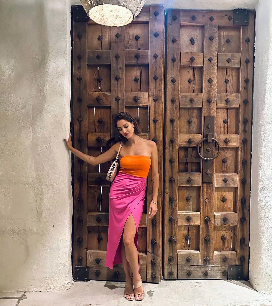 Η Κωνσταντίνα Ευριπίδου, επέλεξε μία ροζ wrap φούστα συνδυάζοντάς την με bright orange top.