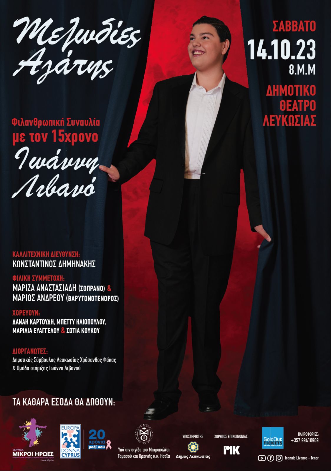 Ο πολυβραβευμένος 15χρονος τενόρος, Ιωάννης Λιβανός, εμπνευστής της Φιλανθρωπικής Συναυλίας ΜΕΛΩΔΙΕΣ ΑΓΑΠΗΣ θα ερμηνεύσει τραγούδια σπουδαίων Ελλήνων και Ξένων Συνθετών, με την συνοδεία 6μελούς Ορχήστρας υπό την διεύθυνση του καταξιωμένου Μαέστρου από τη Βιέννη, Κωνσταντίνου Δημηνάκη.