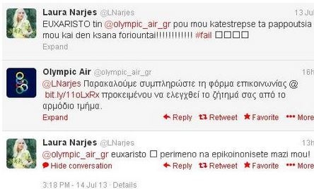 Συγκεκριμέναν η ίδια έγραψε στην προσωπική της σελίδα στο τwitter: «Ευχαριστώ την Olympic Air που μου κατέστρεψε τα παπούτσια μου και δεν ξαναφοριούνται!!!fail». Η απάντηση της εταιρείας ήρθε άμεσα «Παρακαλούμε συμπληρώστε τη φόρμα επικοινωνίας προκειμένου να ελεγχθεί το ζήτημα σας από το αρμόδιο τμήμα». «Ευχαριστώ. Περιμένω να επικοινωνήσετε μαζί μου» έγραψε η παρουσιάστρια!
