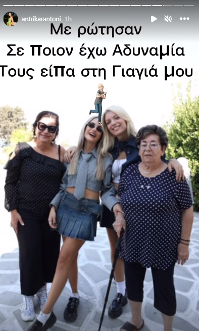 Αυτό το πρόσωπο λοιπόν είναι η γιαγιά της, με την ίδια αναρτώντας εικόνα τους να γράφει τα εξής: "Με ρώτησαν σε ποιον έχω αδυναμία, τους είπα στη γιαγιά μου". Δείτε την εικόνα πιο κάτω:
