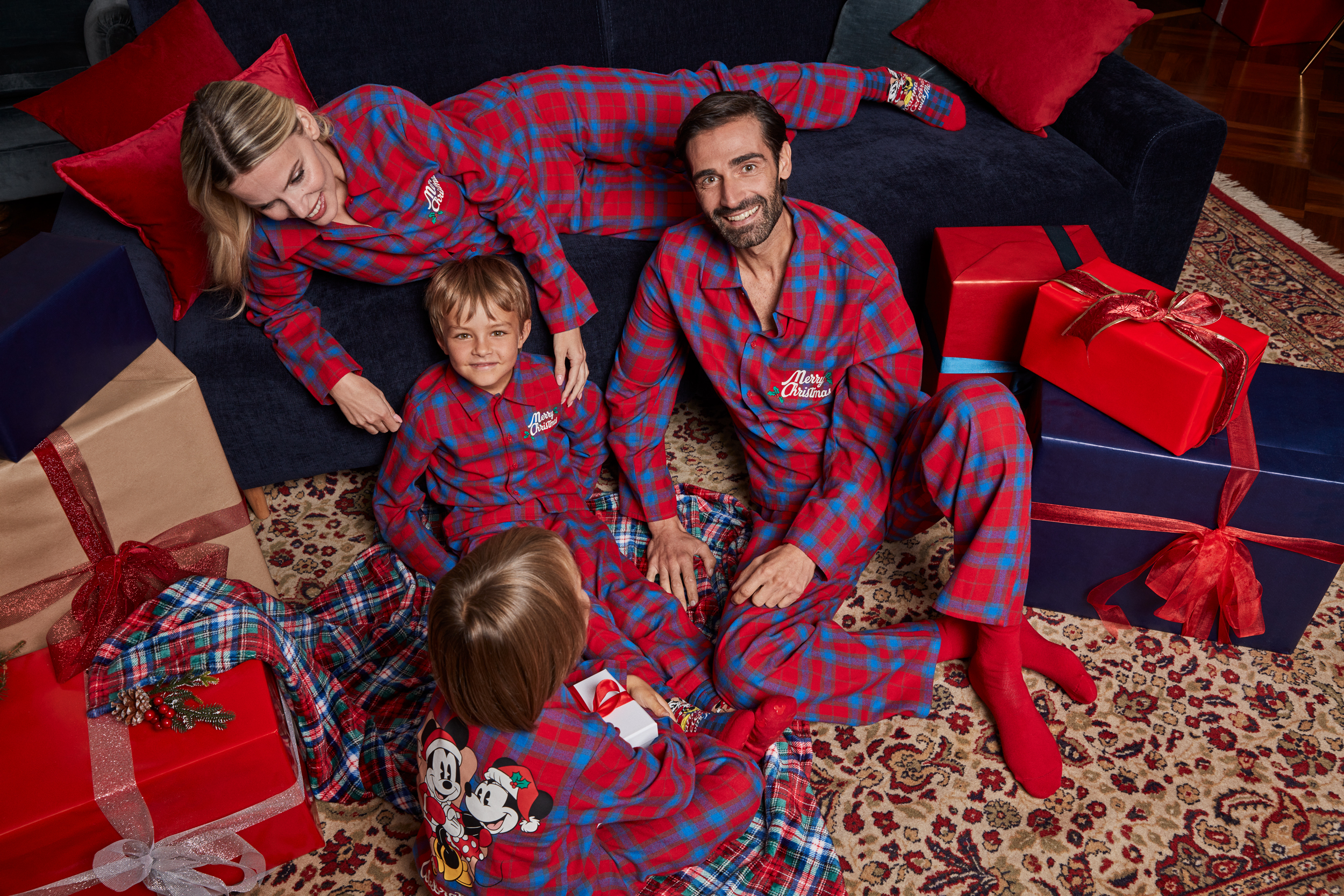 Στις δημιουργίες πρωταγωνιστούν για άλλη μια φορά οι εμβληματικές καρό ταρτάν πιτζάμες και τα διασκεδαστικά μοτίβα όπως o Άγιος Βασίλης, ο Gingerbread man, το αρκουδάκι, οι ήρωες της Disney και ο τάρανδος. Μοτίβα που διακοσμούν ζωηρά jumpers για μικρούς και μεγάλους, για να είναι ασορτί οι εμφανίσεις σας με τους αγαπημένους σας. Κάλτσες και παντόφλες συμπληρώνουν τη μεγάλη γκάμα των homewear.