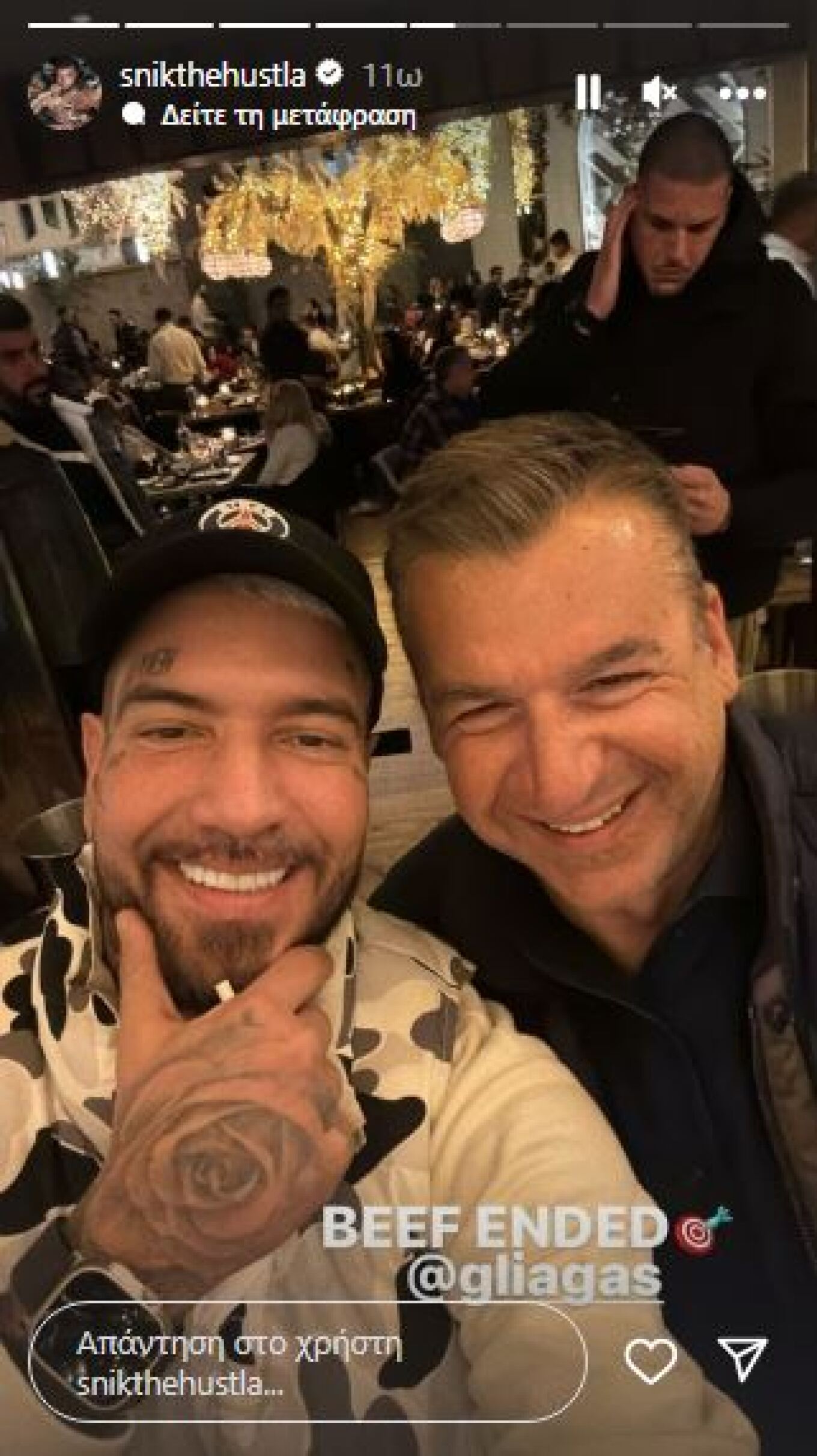 Έτσι λοιπόν ο Snik και ο Γιώργος Λιάγκας, πόζαραν μαζί, με τον πρώτο να κάνει τα αποκαλυπτήρια αναρτώντας σε story του στο instagram, κοινό τους στιγμιότυπο, στο οποίο απεικονίζονται χαμογελαστοί, γράφοντας μάλιστα ο traper τα εξής: "Tο λήξαμε κι αυτό. Beef ended".