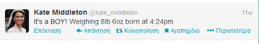 Ένα υγιέστατο αγοράκι έφερε στον κόσμο εχθές το απόγευμα η Kate Middleton δίνοντας τέλος στην ανυπομονησία που επικρατούσε παγκοσμίως, για τον ερχομό του βασιλικού μωρού. Η Δούκισσα του Cambridge και ο πρίγκιπας William ολοκλήρωσαν την ευτυχία τους, αφού από εχθές στις 16.24 που ήρθε ο μικρός βασιληάς στη ζωή τους, έχουν πλημμυρίσει με χαρά κι ευτυχία. Άλλωστε, συναισθήματα σαν κι αυτά είναι έκδηλα και στο μήνυμα που έγραψε στον προσωπικό της λογαριασμό στο twitter η Kate Middleton για τον ερχομό του πολυαγαπημένου της γιου: "Είναι αγόρι! Έχει βάρος 3,8 κιλά, γεννήθηκε στις 4.24pm"