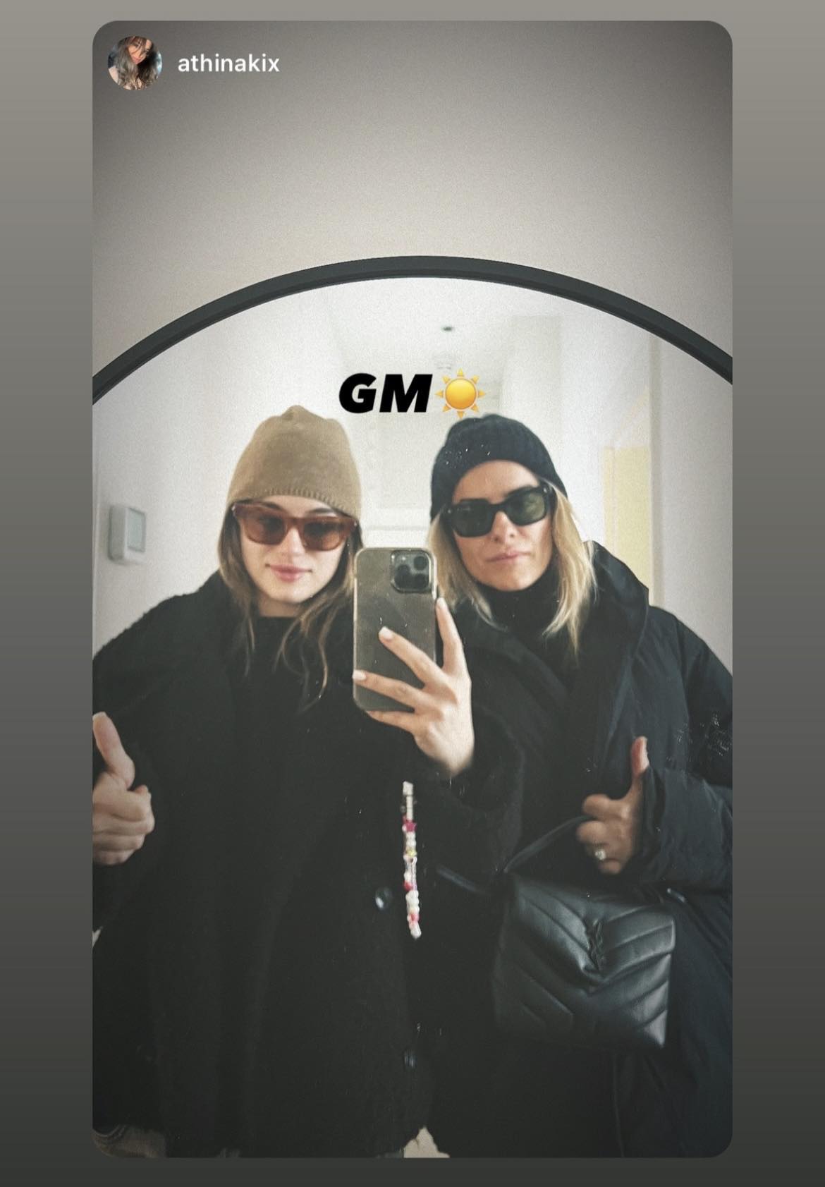 Σε μία από τις βόλτες τους, τις είδαμε να ποζάρουν με ασορτί casual look έχοντας επιλέξει total black outfit σε χειμερινό texture ενώ το look τους ολοκληρώθηκε με πλεκτό, cozy σκουφάκι σε διαφορετικούς χρωματισμούς. Δείτε τη σχετική εικόνα που εντοπίσαμε στα social media: