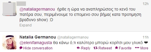 "Ήρθε η ώρα να αναπληρώσεις το κενό του πατέρα σου, περιμένουμε το επόμενο σου βήμα (κατα προτίμηση βραδινό show)", έγραψε φίλη της Ναταλίας στο Twitter και η παρουσιάστρια απάντησε: "Θα κάνω ότι καλύτερο μπορώ"! Αναμένουμε να δούμε την παρουσιάστρια στο νέο της τηλεοπτικό εγχείρημα!