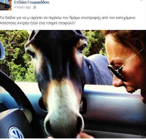 Η Κύπρια τραγουδίστρια ανέβασε και μία χιουμοριστική φωτογραφία με την ίδια να δίνει ένα τσαμπί σταφύλι σε ένα γαϊδουράκο ως διόδια για να την αφήσει να επιστρέψει από τον κατεχόμενο Απόστολο Ανδρέα