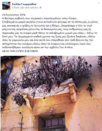 Το κατεχόμενο τμήμα της Κύπρου επισκέφθηκε η Στέλλα Γεωργιάδου και συγκεκριμένα το μοναστήρι του Αποστόλου Ανδρέα. Η ίδια σήμερα έγραψε ένα συγκινητικό μήνυμα στην προσωπική της σελίδα στο facebook με αφορμή την κατάληψη της Αμμοχώστου από τους Τούρκους. Διαβάστε τι έγραψε: