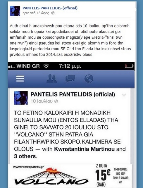Μάταια περίμεναν να εμφανιστεί στην σκηνή περισσότερο από 4500 θαυμαστές του που βρέθηκαν πριν από λίγες μέρες στην Ερέτρεια για να τον απολαύσουν από κοντά. Την ίδια στιγμή ο Παντελής Παντελίδης βρισκόταν στην Κύπρο προκαλώντας τον εκνευρισμό τους. Ο ίδιος δεν μπορούσε να αφήσει να περάσει έτσι ένα τόσο σοβαρό θέμα και όπως ήταν φυσικό έδωσε τις δικές του εξηγήσεις...