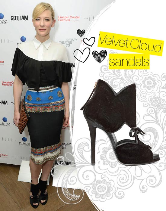Τα είδαμε να τα φορά η Cate Blanchett σε δύο events με διαφορά λίγων ημέρων. Τα επέλεξε για να ολοκληρώσει την total Givenchy εμφάνισή της στο opening night party του θεατρικού έργου Uncle Vanya στη Νέα Υόρκη στις 21 Ιουλίου αλλά και σε party που διοργάνωσε το περιοδικό The Gotham Magazine σε ξενοδοχείο της μητρόπολης των ΗΠΑ στις 25 Ιουλίου όπου τα συνδύασε με pencil φούστα και πουκάμισο. Τα συγκεκριμένα black velvet σανδάλια με λεπτομέρειες από μεταξωτή κορδέλα ονομάζονται velvet cloud και είναι του οίκου Roger Vivier. Ανήκουν στη συλλογή του για το φθινόπωρο του 2012, η τιμή τους αγγίζει τα 850 ευρώ και αποτελούν ένα από τα hot items της επόμενης σεζόν.