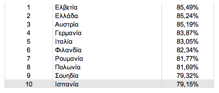 Πρώτη στις προτιμήσεις των χρηστών βάση των κριτικών των χρηστών είναιι η Ελβετία με ποσοστό δημοτικότητας 85,49 τοις εκατό, ενώ έκπληξη προκαλεί η δεύτερη θέση της Ελλάδας με ποσοστό δημοτικότητας 85,24 τοις εκατό. Να σημειωθεί εδώ ότι τα αποτελέσματα βασίζονται στις κριτικές που έχουν γράψει οι χρήστες που έχουν επισκεφτεί τους προορισμούς σκι που διαθέτει η κάθε χώρα, ενώ όλοι οι προορισμοί διαθέτουν από 40 ξενοδοχεία και πάνω. Στην τρίτη θέση και μια θέση κάτω από την Ελλάδα είναι ο παραδοσιακά γνωστός χειμερινός προορισμός, Αυστρία , με 85,19 τοις εκατό ενώ ακολουθεί η Γερμανία με 83,87 τοις εκατό. Η Ιταλία καταλαμβάνει την πέμπτη θέση με ποσοστό 83,25 τοις εκατό ενώ ακόμα πιο κάτω βρίσκεται η Φιλανδία με ποσοστό 82,34 τοις εκατό.