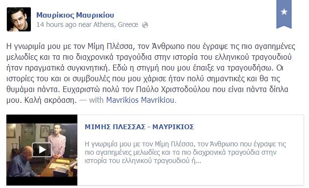 Στο προσωπικό του λογαριασμό ο νεαρός τραγουδιστής ανάρτησε το παρακάτω βίντεο που ακολουθεί και μιλά ο ίδιος για την συγκινητική στιγμή που ο γνωστός συνθέτης έπαιζε στο πιάνο δικές του αγαπημένες συνθέσεις και ο Μαυρίκιος τις ερμήνευε με τον μοναδικό τρόπο που εκείνος ξέρει.