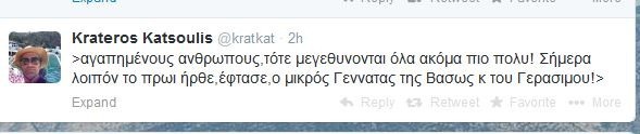 Τα καλά νέα ανακοίνωσε μέσω twitter ο καλός φίλος του ηθοποιού, Κρατερός Κατσούλη. Συγκεκριμένα ο ηθοποιός έγραψε: "Όταν έρχεται ένα παιδάκι στο Κόσμο, ακόμα και σε αυτόν, είναι είδηση μεγάλης χαράς νίκης και πανηγυρισμού! Όταν αυτό είναι από δικούς σου αγαπημένους ανθρωπους, τότε μεγεθύνονται όλα ακόμα πιο πολύ! Σήμερα, λοιπόν, το πρωι ήρθε, έφτασε, ο μικρός Γεννατάς της Βάσως κ του Γεράσιμου!