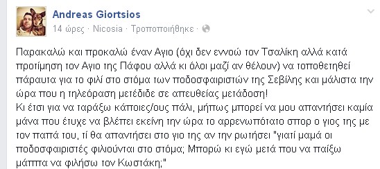 "Παρακαλώ και προκαλώ έναν Αγιο (όχι δεν εννοώ τον Τσαλίκη αλλά κατά προτίμηση τον Αγιο της Πάφου αλλά κι όλοι μαζί αν θέλουν) να τοποθετηθεί πάραυτα για το φιλί στο στόμα των ποδοσφαιριστών της Σεβίλης και μάλιστα την ώρα που η τηλεόραση μετέδιδε σε απευθείας μετάδοση! Κι έτσι για να ταράξω κάποιες/ους πάλι, μήπως μπορεί να μου απαντήσει καμία μάνα που έτυχε να βλέπει εκείνη την ώρα το αρρενωπότατο σπορ ο γιος της με τον παπά του, τί θα απαντήσει στο γιο της αν την ρωτήσει "γιατί μαμά οι ποδοσφαιριστές φιλιούνται στο στόμα; Μπορώ κι εγώ μετά που να παίξω μάππα να φιλήσω τον Κωστάκη;", με αυτά τα λόγια πέρασε το δικό του μήνυμα για το φιλί των δυο ποδοσφαιριστών.