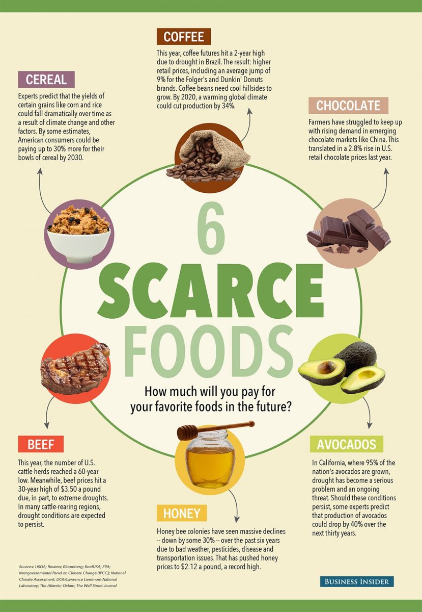 Όσο και αν φαίνεται παράξενο, έξι βασικές τροφές που αυτή τη στιγμή τις θεωρούμε δεδομένες, στο άμεσο μέλλον θα κοστίζουν αρκετά ακριβά. Σύμφωνα με το Business Insider, πρόκειται για τον καφέ, τη σοκολάτα, τα δημητριακά, το μέλι, το αβοκάντο και το μοσχαρίσιο κρέας.