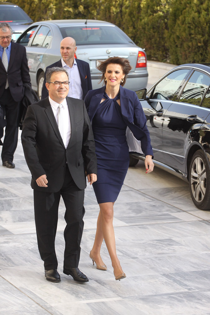 Η Όλγα Κεφαλογιάννη, «αρχοντική» όπως πάντα, επέλεξε να φορέσει σακάκι με βαθύ ντεκολτέ και κλος φούστα μέχρι το γόνατο, όλα σε γκρι τόνους. Τσάντα και γόβες στο απόλυτο μαύρο.