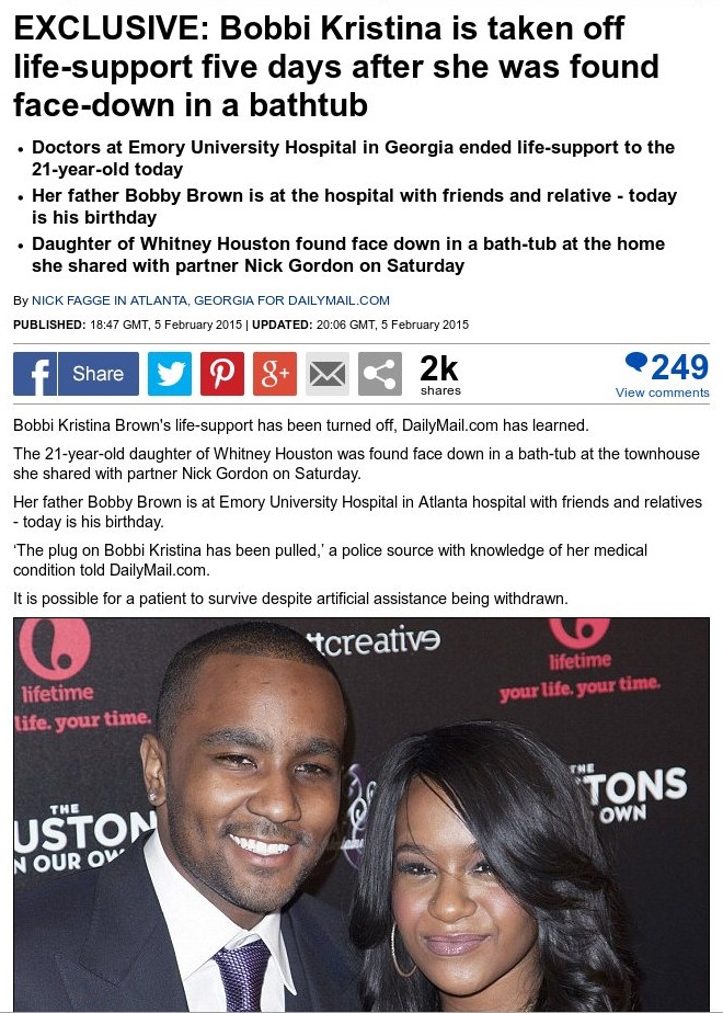 Χθες η mailonline, έγραψε ότι οι γιατροί βγάλανε την Bobbi Cristina από την μηχανική υποστήριξη πέντε μέρες αφότου μεταφέρθηκε στο νοσοκομείο σε κρίσιμη κατάσταση.