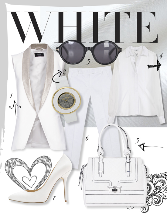 1. Αμάνικο γιλέκο €22.99 MANGO / 2. Ρολόι χεριού επιχρυσωμένο ατσάλι και δερμάτινο λουράκι OXETTE / 3. Γυαλιά ηλίου Persol €216 GRAND OPTICAL / 4. Πουκάμισο G.F Ferre PROVA / 5. Δερμάτινη τσάντα €190 GUESS / 6.Λευκό κάπρι παντελόνι €39.95 BENETTON / 7.Δερμάτινη γόβα €89 ALDO