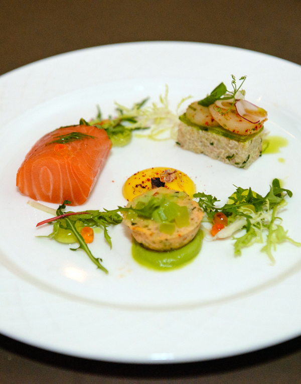 Το μενού περιελάβανε πιάτα πραγματικά απολαυστικά και γεύσεις που αξίζουν βράβευσης. Ξεκίνημα έγινε με σιγοψημένο σολομό με αρωματικά σερβιρισμένο με χτένια με ζελέ πράσινου μήλου. Ένα εξαίσιο πιάτο τιμπάλ σολομού με χτένια σε αβοκάντο, σαλάτα κινόα, μαγιονέζα με σάφρανο. Το κυρίως πιάτο ήταν μια τριλογία μοσχαριού που περιελάβανε ψηρό φιλέτο, κανελόνι από μάγουλα και άγρια μανιτάρια, μπρόκολο, αγκινάρες και σπανάκι σε φύλο κρούστας, γλυκάδια πανέ και εσπούμα μαϊντανόριζας. Τέλος, το επιδόρπιο έκλεψε την παράσταση. Ένα ντελικάτο μους άσπρης σοκολάτας με ζελέ από ρόδι και παντεσπάνι δυόσμου, χλιαρό κέικ πικρής σοκολάτας, με παγωτό γλυκανίσου και σάλτσα μάνγκο. Τα πιάτα ήταν συνοδευμένα από εξαιρετικούς εγχώριου οίνους. Το πρώτο πιάτο συνοδεύτηκε από Viogner 2014, Αργυρίδης, το κυρίως με Shiraz 2013, Βλασίδη και επιδόρπιο με Κουμανδαρία Τσιάκκας 2008.