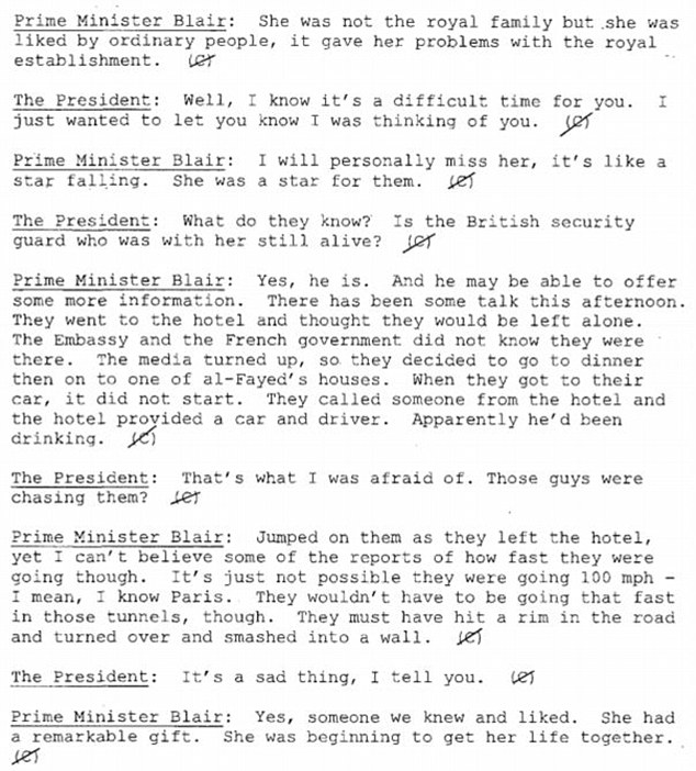 Στην απομαγνητοφώνηση της τηλεφωνικής συζήτησης που είχαν την 1 Σεπτέμβρη του 1997 οι δυο ηγέτες σχολίαζαν το γεγονός ότι η αδικοχαμένη πριγκίπισσα ήταν ιδιαίτερα αγαπητή από τους «απλούς ανθρώπους», με τον Τόνι Μπλερ να λέει: «Προσωπικά θα μου λείψει. Ήταν σαν να γκρεμίστηκε ένα αστέρι. Ήταν αστέρι για εκείνους».